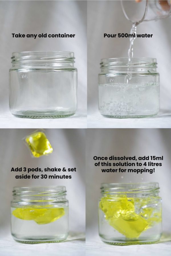 USE: Their outer cover is made up of polyvinyl alcohol (PVA/PVOH), which dissolves in water, releasing the concentrate inside. In about an hour, a clear, fragrant solution is ready, which you can use as usual i.e. adding 15ml of it into a bucket of 4 litres of water to mop the floor. Please refer to the leaflet inside for detailed instructions on mixing; the images on the left will help you get an idea as well.