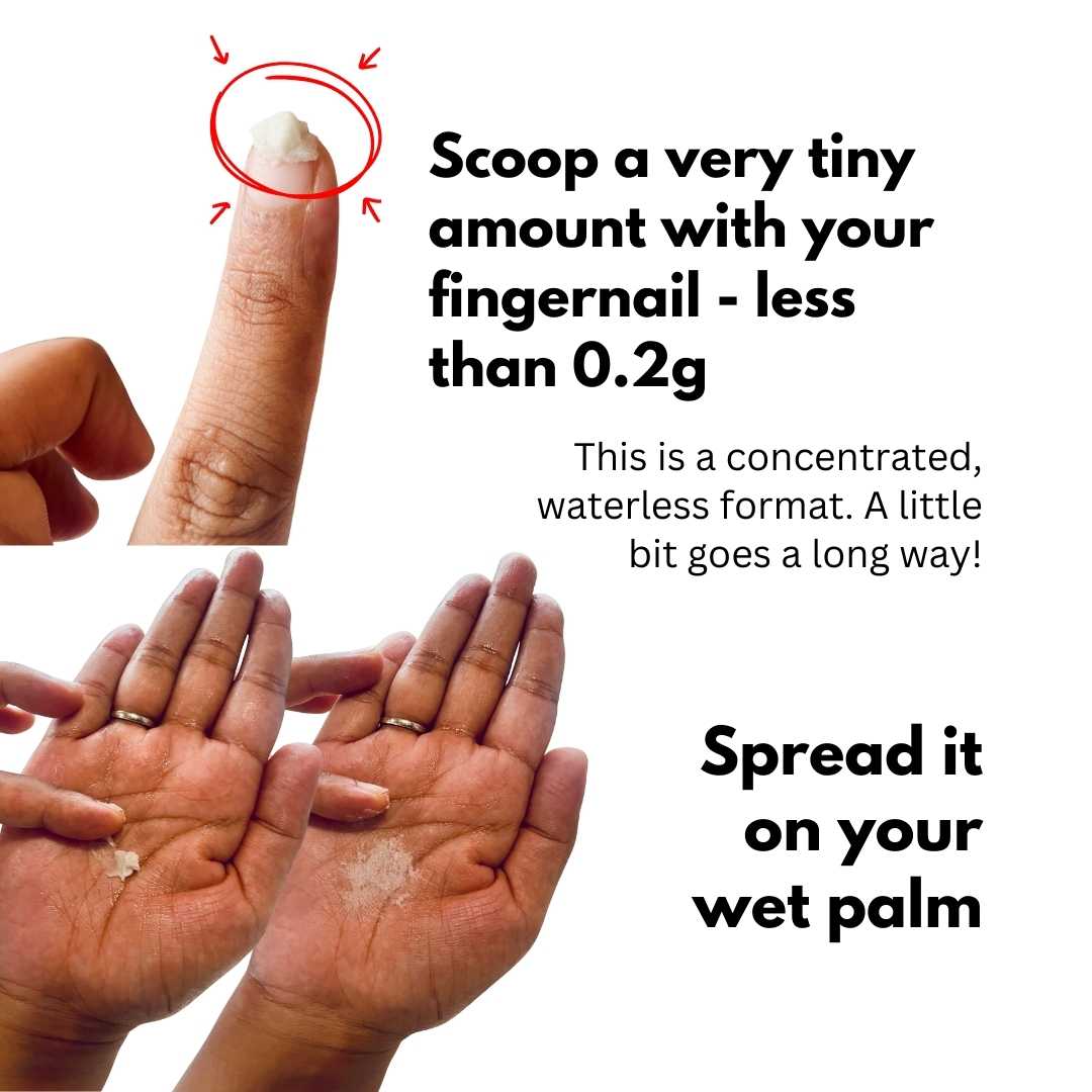 Scoop a very small amount (less than 0.2g) with the back of your fingernail. Spread on your wet palm and rub to generate a generous lather.