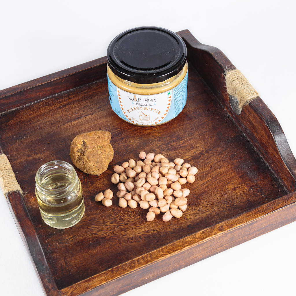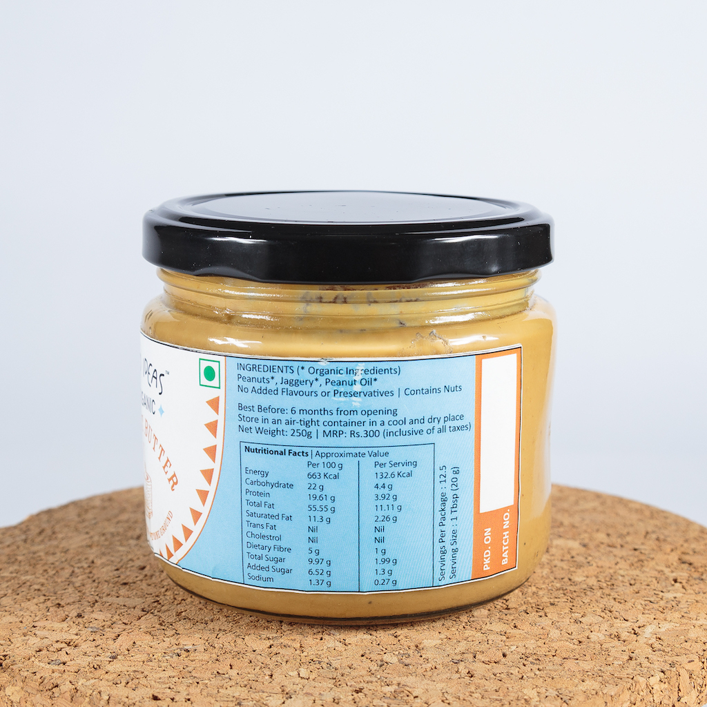 Upgrade your toast with this simple, pure, and delicious Organic Peanut Butter. Unlike commercial spreads that rely on refined sugar, hydrogenated oils, or emulsifiers, ours is made with just three wholesome ingredients: sand-roasted Peanuts, natural Jaggery, and Peanut oil. The traditional sand-roasting process enhances the flavour of the peanuts, resulting in a delicious and nutritious spread. It contains No Added Flavours or Preservatives, ensuring you get pure, wholesome goodness in every jar.