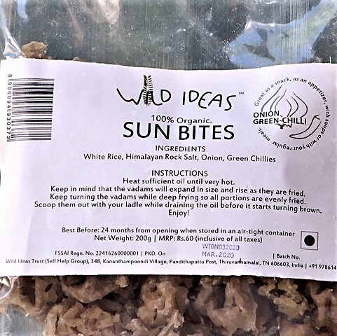 The Wild Ideas Sun Bites are bite-sized, sun-soaked treats that offer a wholesome, organic upgrade to your regular snacks. These fryums are made using nutritious Organic Ragi (Finger Millet) and White Rice, seasoned simply with Himalayan Rock Salt and a blend of spices. Unlike conventional snacks, they contain no artificial ingredients and provide a great source of natural goodness. They are wonderfully versatile—perfect as a standalone snack, appetizer, or a crisp addition to soups or your regular meal.