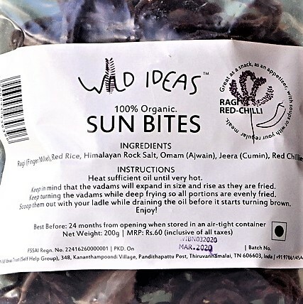 The Wild Ideas Sun Bites are bite-sized, sun-soaked treats that offer a wholesome, organic upgrade to your regular snacks. These fryums are made using nutritious Organic Ragi (Finger Millet) and White Rice, seasoned simply with Himalayan Rock Salt and a blend of spices. Unlike conventional snacks, they contain no artificial ingredients and provide a great source of natural goodness. They are wonderfully versatile—perfect as a standalone snack, appetizer, or a crisp addition to soups or your regular meal.